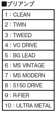 【COMP/FX(コンプレッサー/エフェクト)=COMP、T.WAH、AC SIM】、【OD/DS(オーバードライブ/ディストーション)=BOOST、OD-1、T-SCREAM、BLUES、DIST、CLASSIC、MODERN、METAL、CORE、FUZZ】、【PREAMP(プリアンプ)=CLEAN、TWIN、TWEED、VO DRIVE、BG LEAD、MS VINTAGE、MS MODERN、5150 DRIVE、R-FIER、ULTRA METAL】、【MODULATION(モジュレーション)=CHORUS、PHASER、FLANGER、ROTARY、UNI-V、TREMOLO、HARMONIST、OCTAVE】、【DELAY=1-99ms、100-990ms、1000-6000ms、TAP】、【REVERB(リバーブ)=ROOM、HALL】、【PEDAL FX(ペダル・エフェクト)=WAH、+1 OCTAVE、-1 OCTAVE、FREEZE】、【NS(ノイズ・サプレッサー)】
